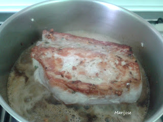 Adobamos el lomo con ajo, sal, pimenta, perejil y las hierbas y dejamos unas horas o mejor toda la noche y lo doramos en una cazuela con aceite