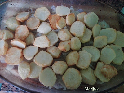 Pelamos , lavamos y cortamos las patatas en rodajas no muy gruesas y las freimos un poco .En una fuente para horno colocamos el sofrito de cebolla y las patatas