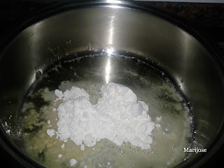 Hacemos ahora una bechamel y para ello doramos en una cazuela o sarten honda un par de cucharadas de harina en una cucharada de aceite de oliva