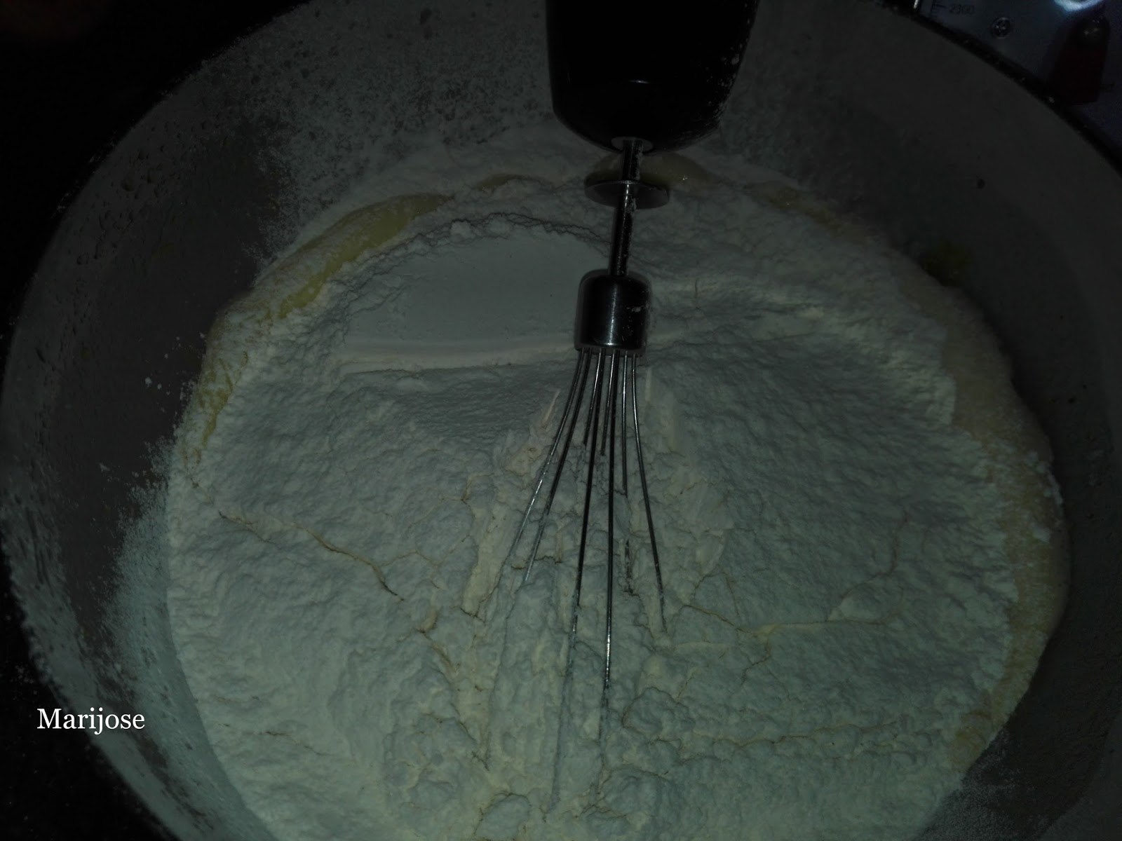 Añadimos la harina tamizada junto con la levadura y los gasificantes y seguimos batiendo despacio hasta que este bien integrada.