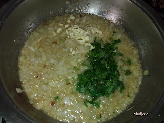 En el mismo aceite sofreimos la cebolla picada muy fina, cuando este transparente añadimos los ajos picados y el perejil y rehogamos