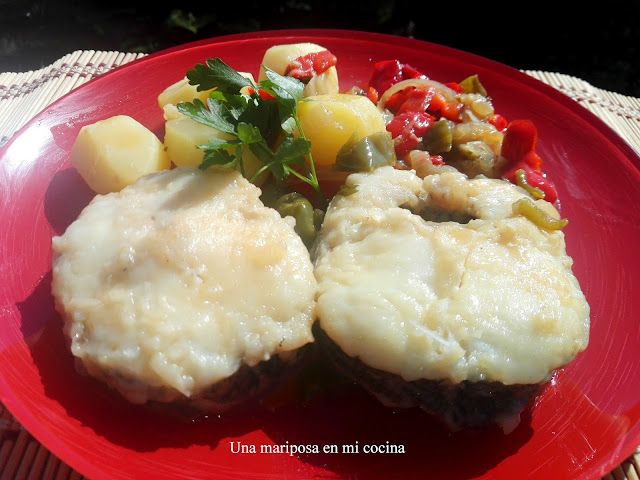 Y lista para servir, acompañada de un poco del sofrito de pimientos y unas patatitas al vapor queda deliciosa