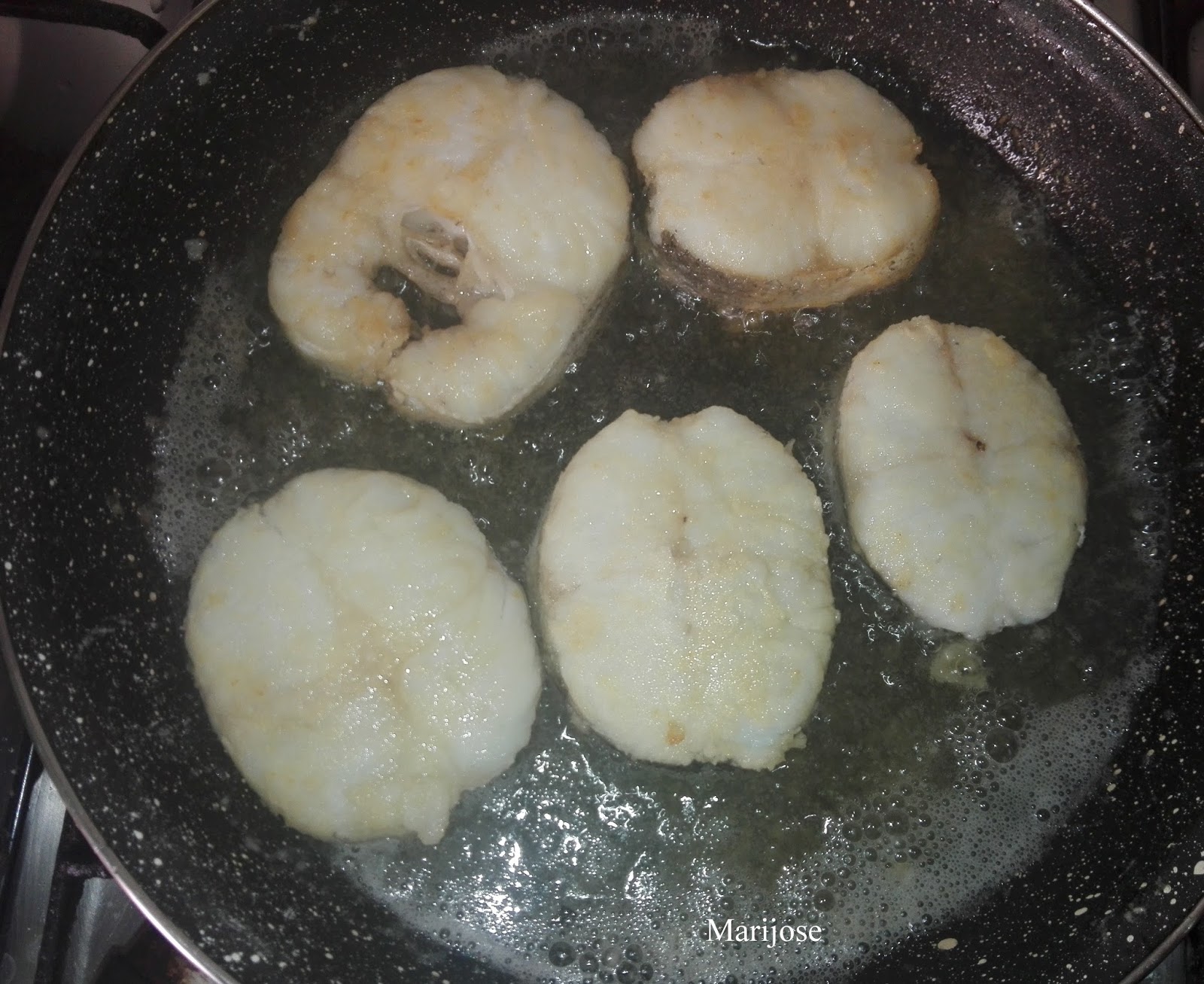 Salpimentamos las rodajas de merluza un rato antes de cocinarla, luego la pasamos por harina y freimos en una sarten con un poco de aceite sin dorarla mucho y reservamos.