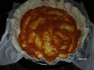 Forramos un molde con la masa de hojaldre(utilizamos el papel que trae) y extendemos en la base con unas cucharadas de salsa de tomate