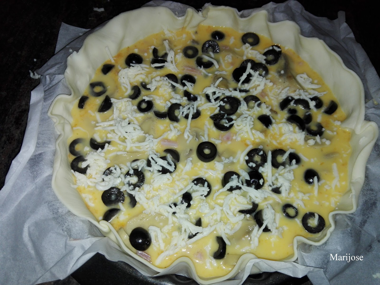 Batimos los huevos junto con la leche y una pizca de sal y pimienta y vertemos sobre la quiche, espolvoreamos con el resto del queso y las aceitunas y metemos a horno precalentado a 200º una media hora
