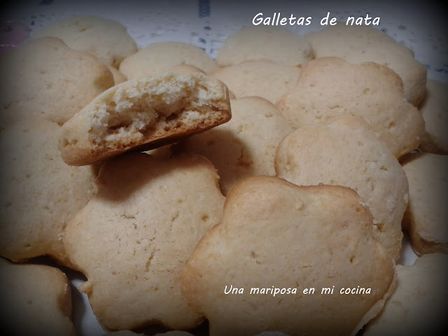 Vi estas galletas en el blog Las recetas de mama , no llevan mantequilla, ni aceite ni ningun tipo de grasa, tan solo nata y me llamaron la atencion asi que habia que probarlas, y lo cierto es que estaban buenisimas, quedan unas galletas con una textura abizcochada que me han encantado.