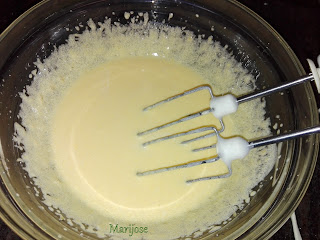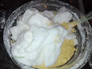 Por ultimo añadimos las claras batidas a punto de nieve y mezclamos bien  con una espatula con movimientos envolventes