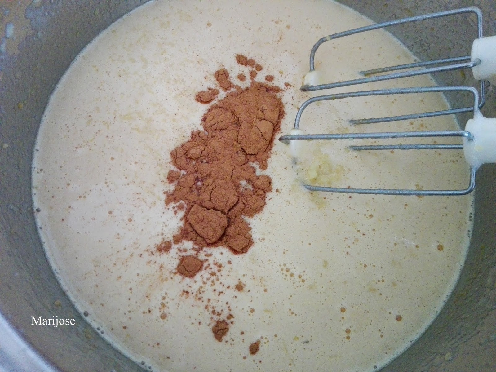 Batimos los ingredientes de la masa, añadimos la harina mezclada con la levadura y mezclamos bien.