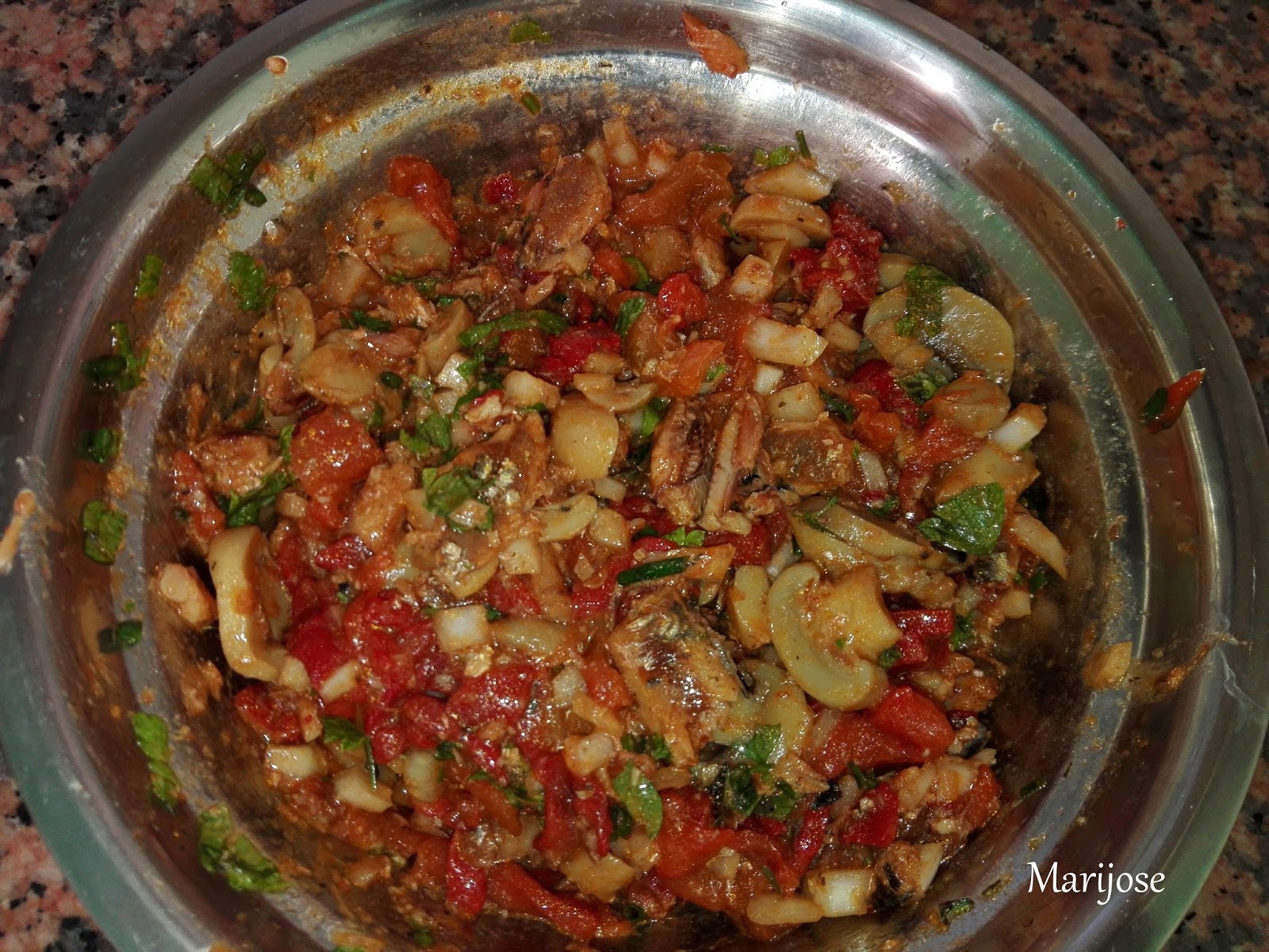Escurrimos las sardinas de su aceite, (si son en salsa la dejamos), cortamos en trocitos  y mezclamos con los demas ingredientes .