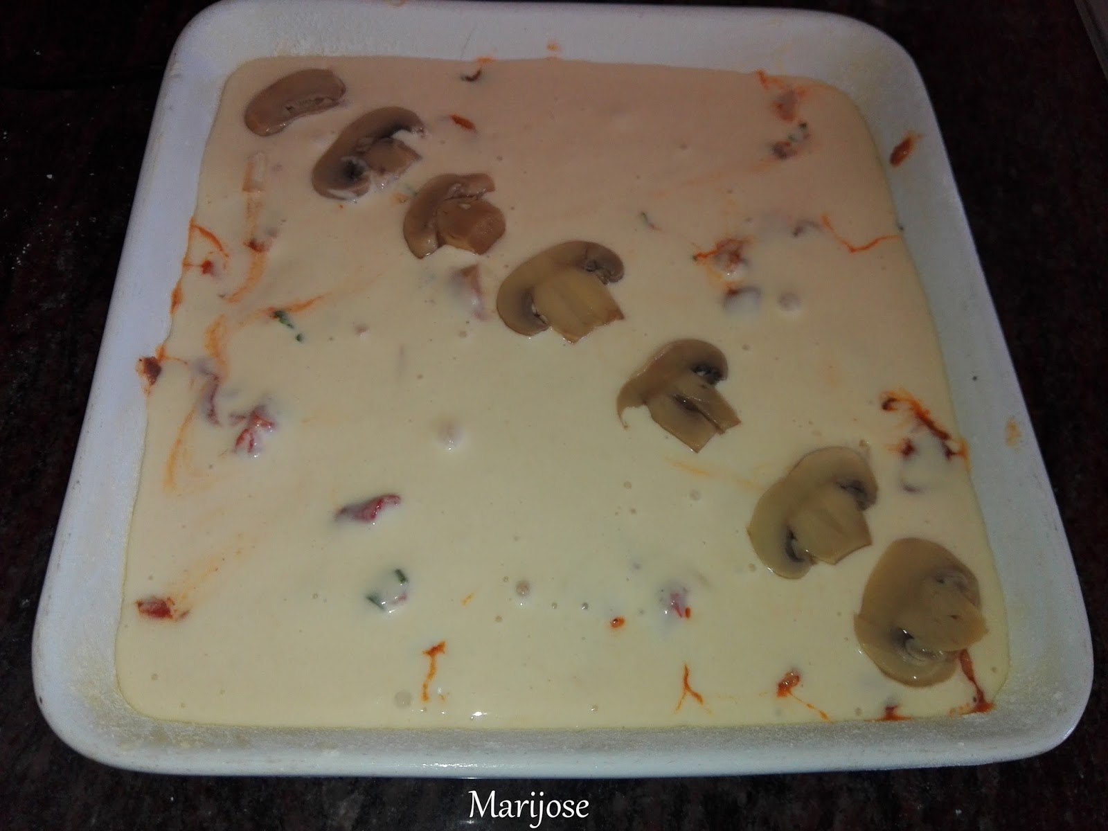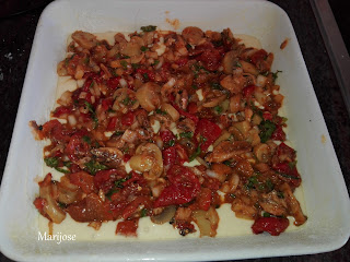 En una fuente para horno enmantecada y enharinada ponemos la mitad de la masa