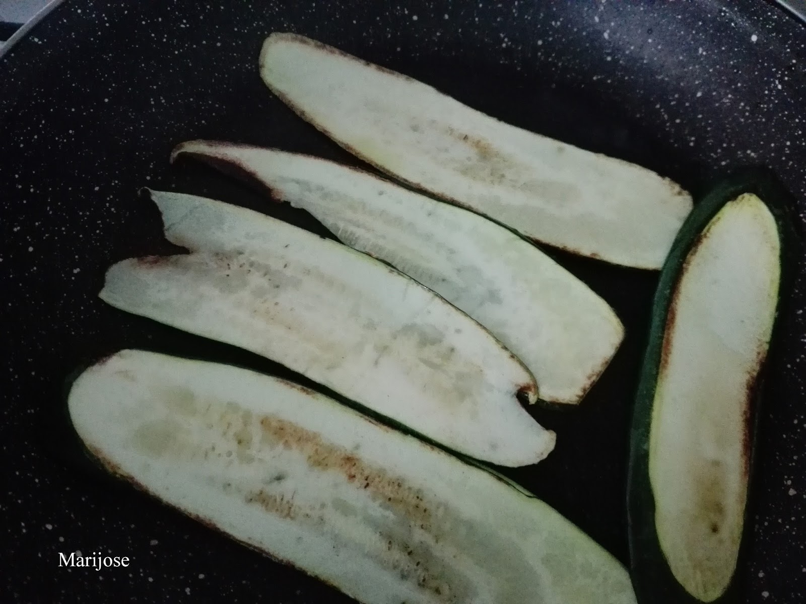 Lavamos el calabacin, cortamos en lonchas finas con una mandolina o un cuchillo bien afilado, las pincelamos de aceite y doramos en la plancha unos segundos por cada lado.