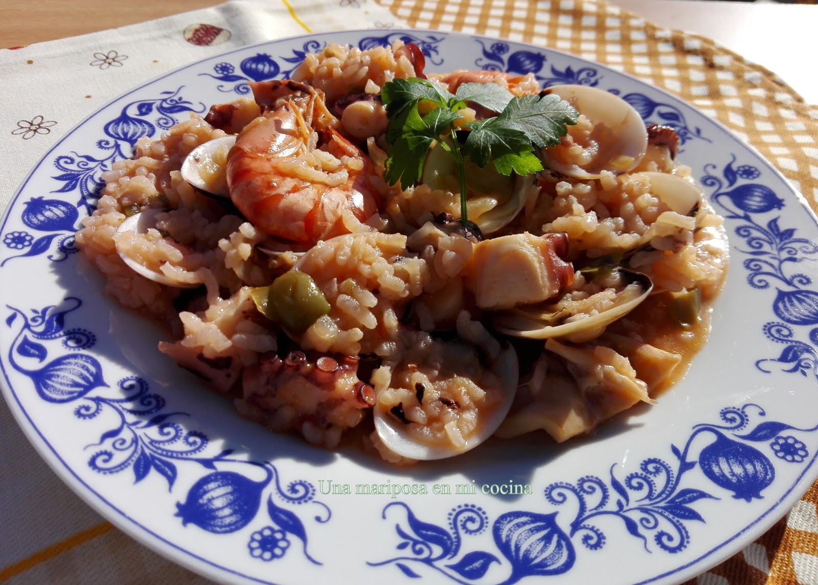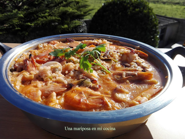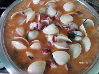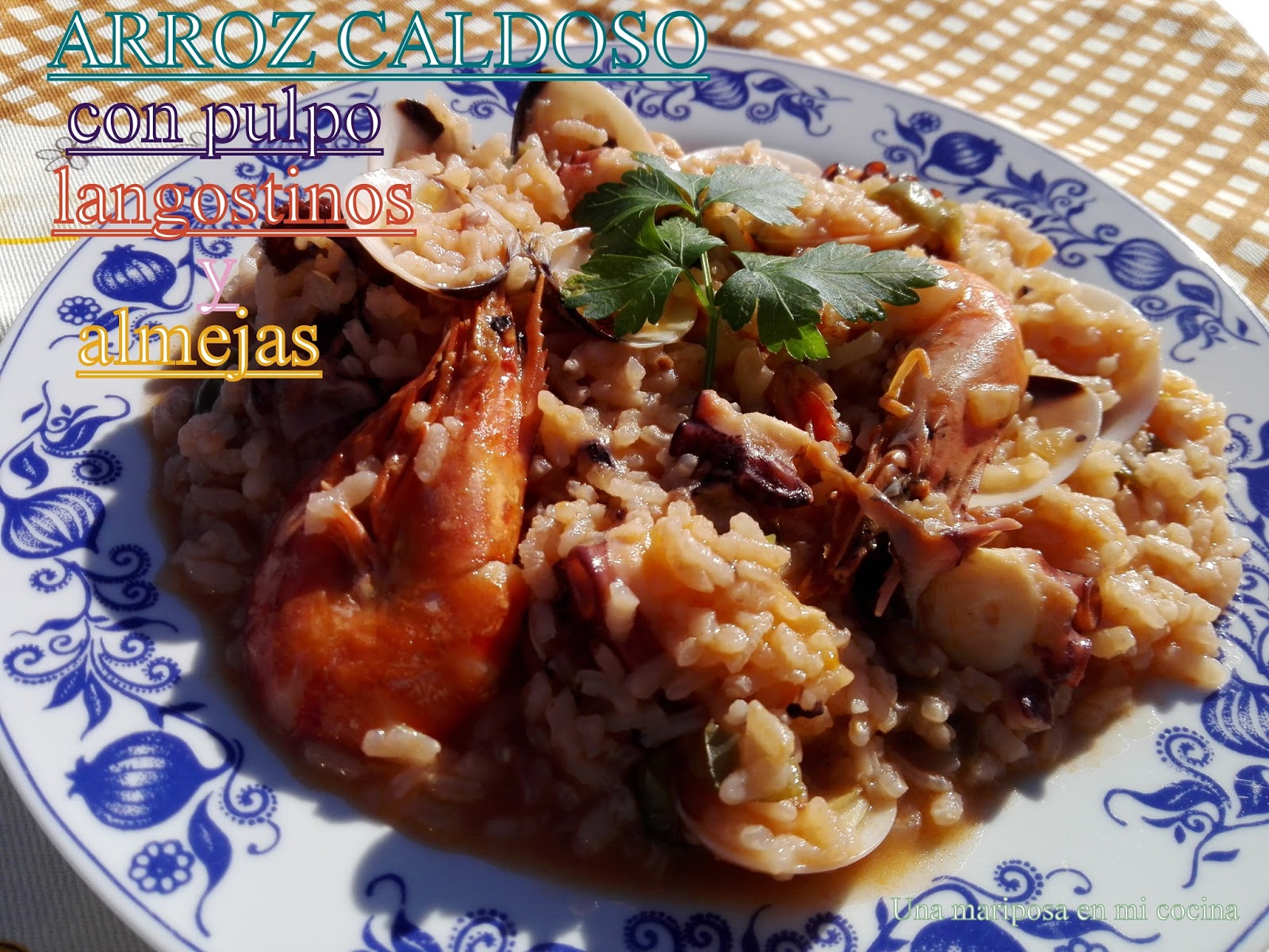 Ya hacia tiempo que no preparaba un arrocito marinero , en casa somos muy arroceros pero tenemos especial predileccion por los que tienen sabor a mar, la idea era preparar un arroz con pulpo para la comida, pero tenia unas cuantas almejas y langostinos en el congelador asi que porque no incorporarlos al arroz, si con pulpo solo ya esta exquisito, con los langostinos y las almejas esta para quitarse el sombrero, a mi me gusta caldosito pero si os gusta mas seco con añadir menos agua esta solucionado,resultado, un plato que a pesar de su sencillez bien podria lucir en una mesa festiva no os parece?