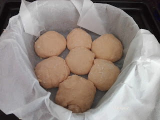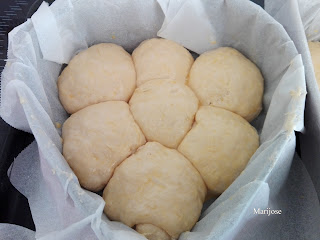 hacemos bolitas y colocamos en el molde un poco separadas entre si y dejamos levar de nuevo tapado una media hora o 45 minutos hasta que vuelva a doblar su volumen
