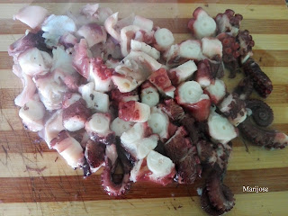 Limpiamos bien el pulpo y cocemos en agua hirviendo con un trozo de cebolla unos 20-30 minutos hasta que este tierno