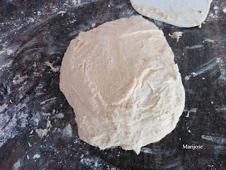 Volcamos la masa sobre la encimera espolvoreada de harina ,desgasificamos sobandola un poco y cortamos trocitos de unos 50 grs de peso cada uno.