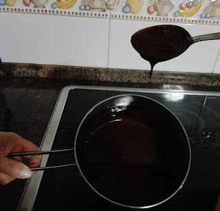 Ya bien cuajada preparamos la cobertura y para ello ponemos en un cazo al fuego la nata con el chocolate y la mantequilla ,cuando empiece a hervir retiramos y removemos continuamente hasta que se funda y dejamos enfriar.