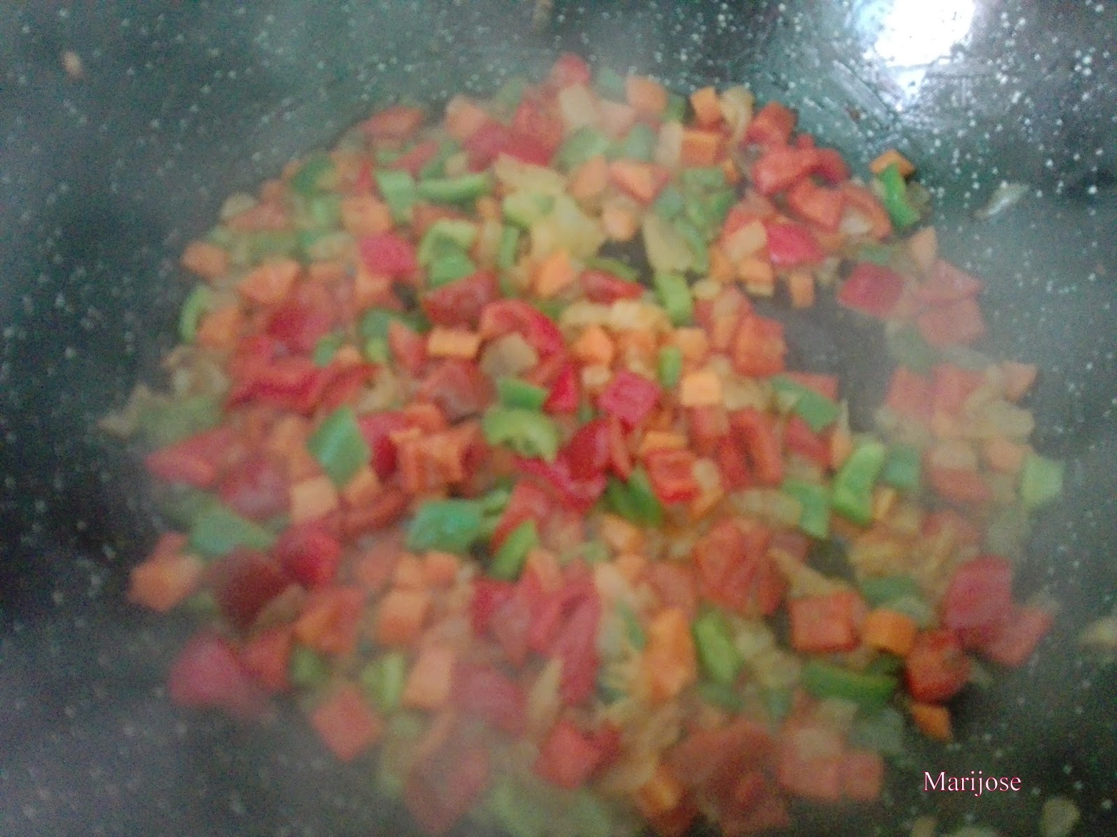 En una cazuela baja y amplia sofreimos la cebolla y pimientos en rodajas y los ajos en laminas hasta que este transparente