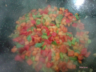 Añadimos los pimientos y la zanahoria , salpimentamos y salteamos unos minutos mas hasta que esten tiernos y retiramos.