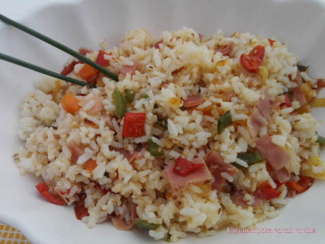 Hola chic@s, hoy os traigo un plato rapidito de hacer para esos dias que no tenemos mucho tiempo o aquellos otros que estemos en plan vago y no nos apetezca meternos mucho tiempo en la cocina, un plato principal y completo ,el cual tambien podemos acompañar de un huevo escalfado, cocido o a la plancha, o bien podemos eliminar el jamon del arroz y cuajar con el una tortilla francesa, en cualquier caso tendremos un plato con vitaminas, proteinas y carbohidratos, en definitiva, un plato sencillo con el que comer bien por poco dinero, ideal para depurarnos de los excesos navideños y ayudarnos a superar la cuesta de Enero no os parece?. Y ahora quiero enseñaros el super regalo que me han dejado los Reyes Magos este año, os dire que mi horno aunque cocia perfectamente estaba ya muy viejillo asi que mis hijos le encargaron uno a los reyes para mi y me han dejado esta preciosidad de ultima generacion