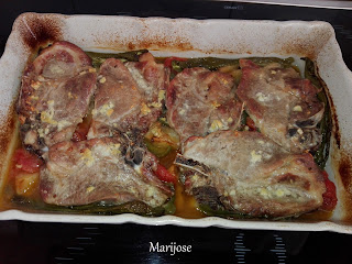 Colocamos las chuletas por encima, regamos con el resto del adobo y medio vasito de agua y metemos a horno precalentado a 200º
