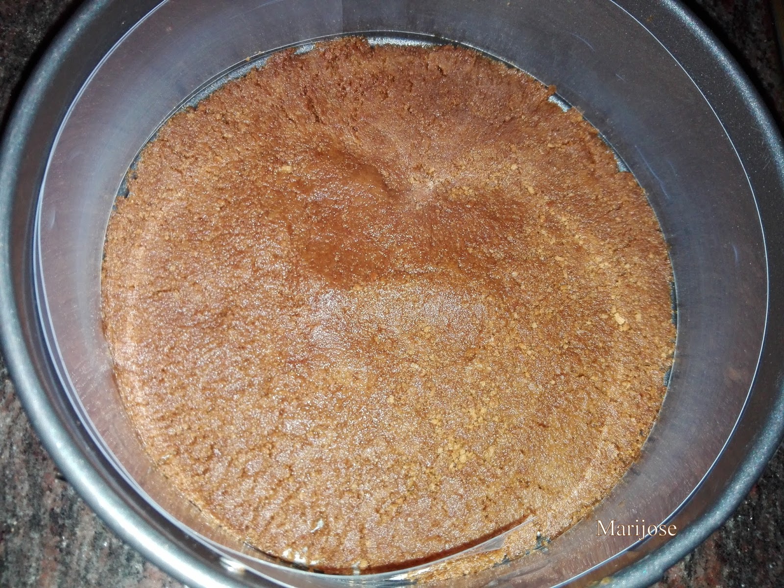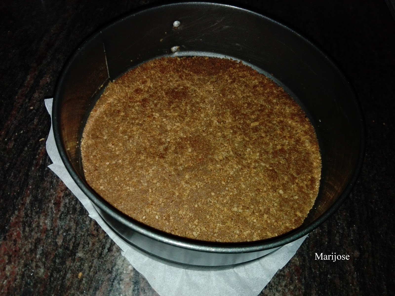 Forramos la base de un molde desmontable con papel de horno , vertemos la mezcla de galleta presionando bien con una cuchara y reservamos en la nevera.