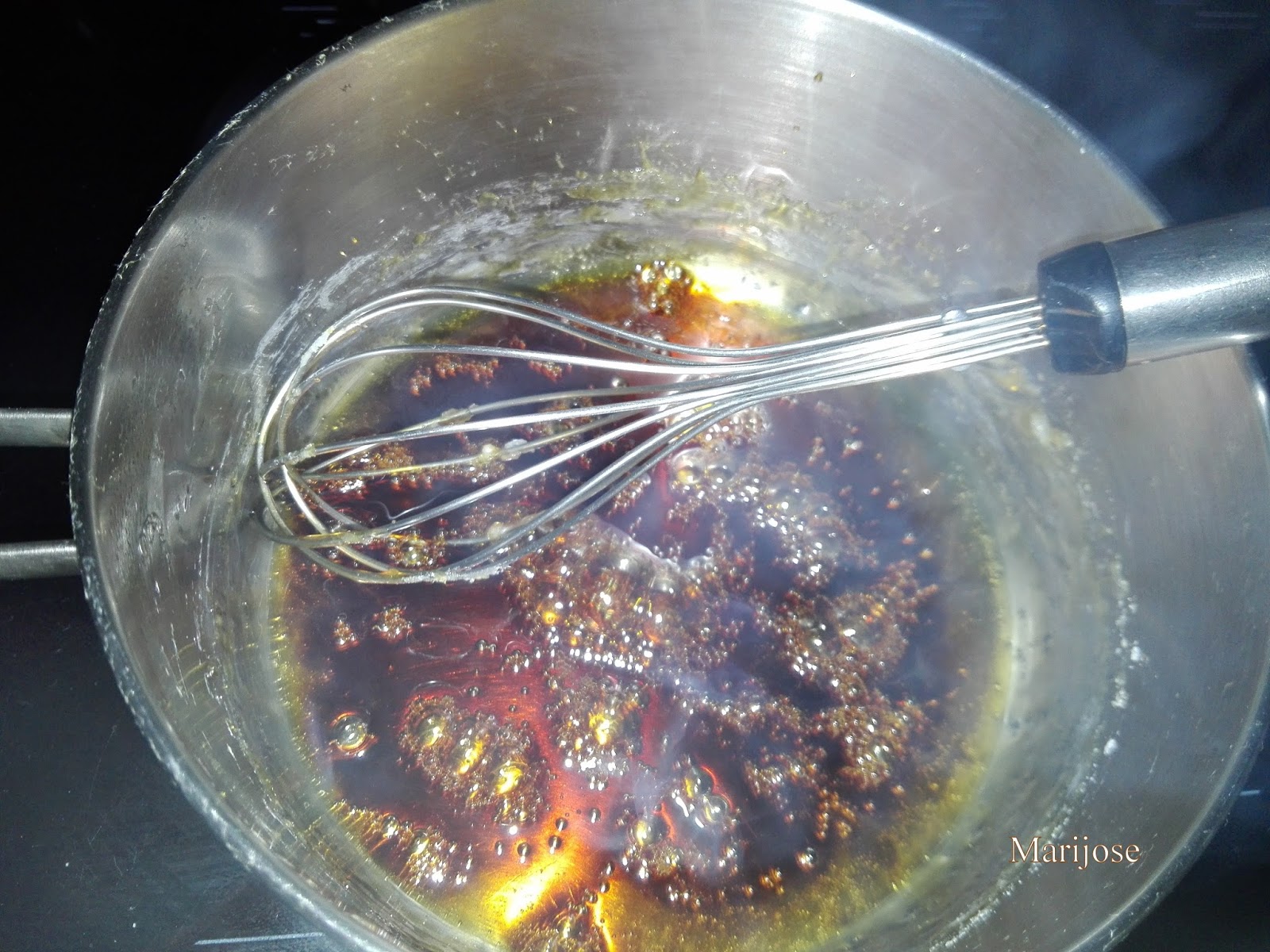 Retiramos del fuego dejamos templar un poco y aun caliente añadimos la gelatina bien escurrida removiendo para que se disuelva bien