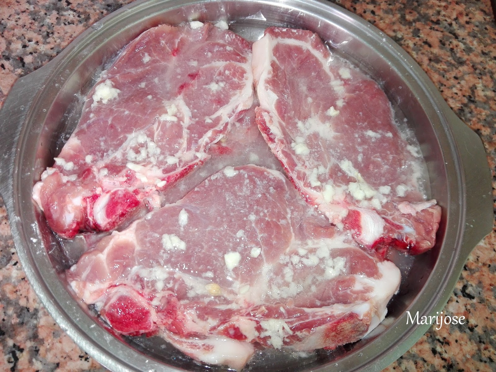 En un mortero machacamos los ajos con un poquitin de sal, mezclamos con el zumo de limon y un chorrito de aceite y adobamos las chuletas la noche anterior o unas horas antes de cocinarlas .