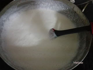 Añadimos la leche y la vainilla y mezclamos con movimientos envolventes para que no pierda aire y se baje