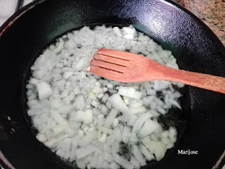 Mientras en una sarten con unas cucharadas de aceite de oliva sofreimos la cebolla y el ajo picado